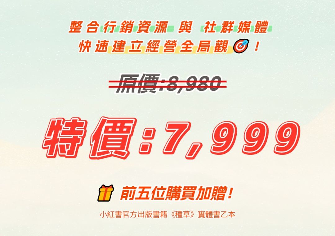 🎯 適合這樣的你<br>想一次搞懂小紅書,從入門到經營生態系全面掌握!<br><br>📚 一次擁有:<br>✔️ 從沒方向到穩定產出的實戰課 📈<br>✔️ 台灣品牌經營小紅書|紅利放大實戰策略 🚀<br>✔️ 90天 XHS Insider 實戰社群👥:資源分享、成長交流<br>✔️ 《種草》社群線上讀書會門票 💬<br><br>💡 這裡不只是一堂課,而是長期成長、持續變強的圈層環境💪!